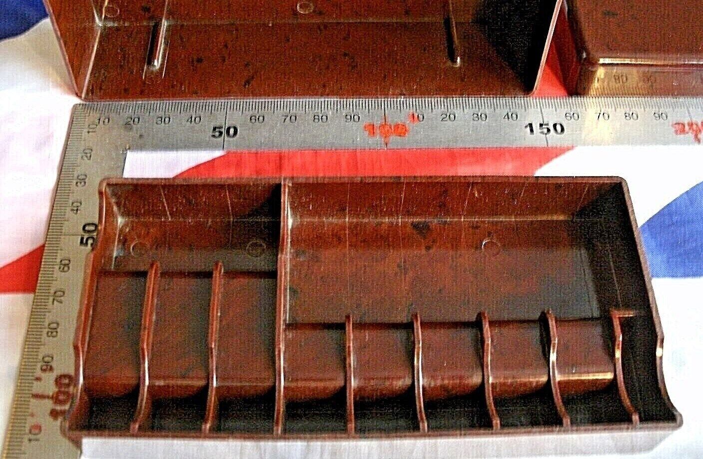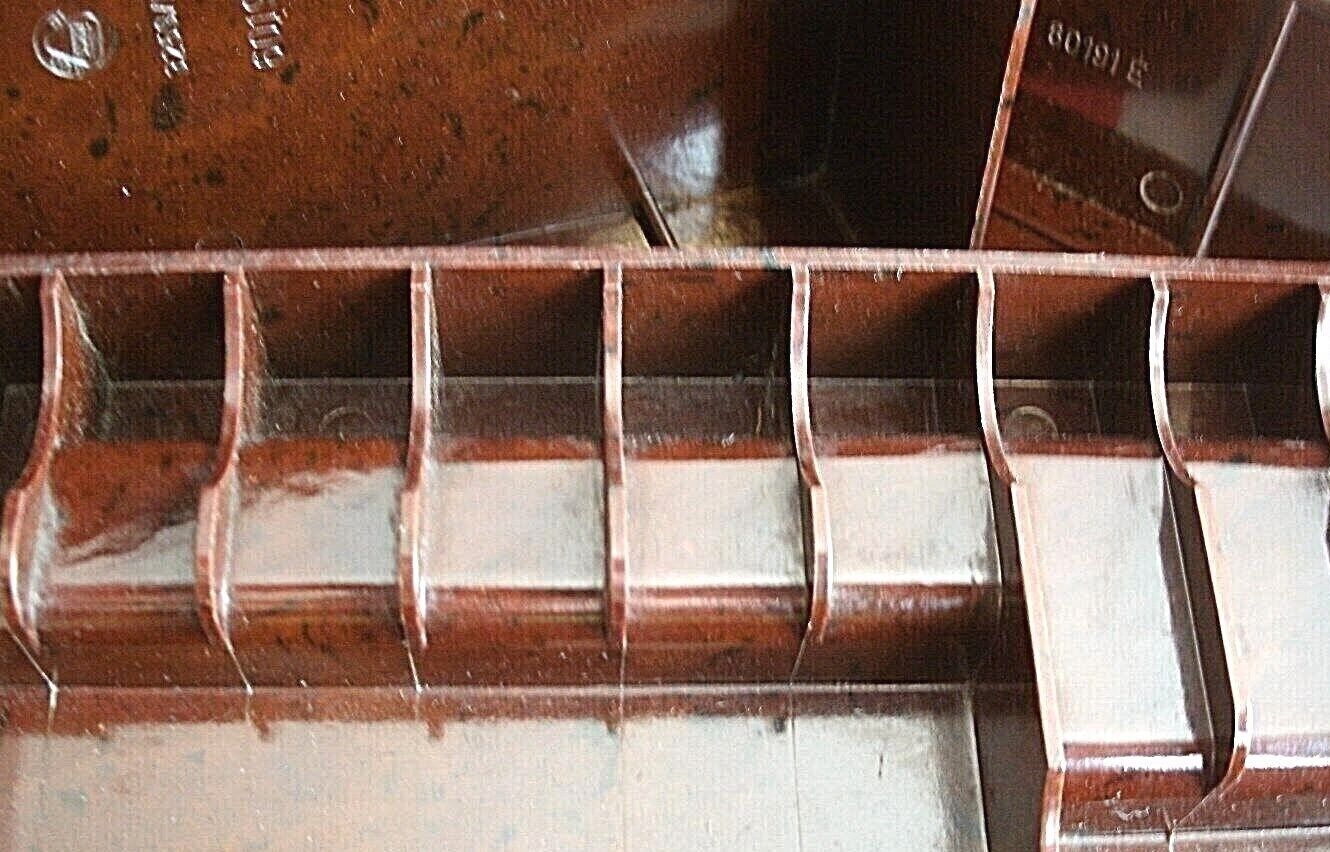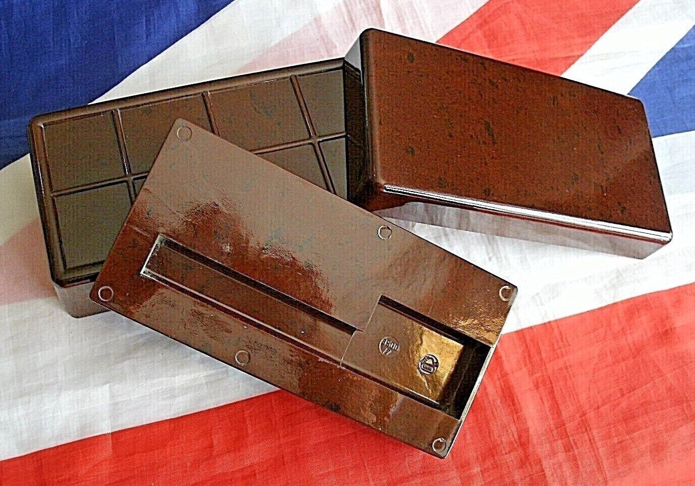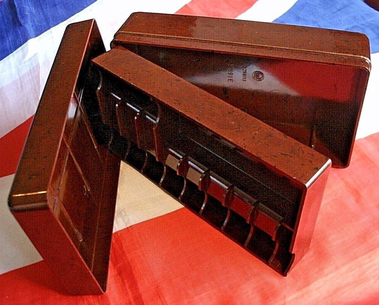 This dark brown Bakelite box has a lovely patina for its,60 + years of age or may even more its so very difficult to ready tell.